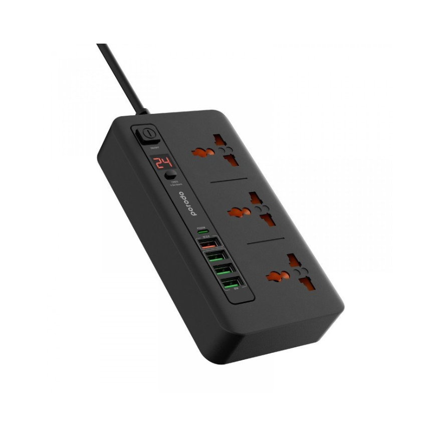 Porodo 3‑AC & 4‑USB Power Super Hub – Black (2M, UK Plug)