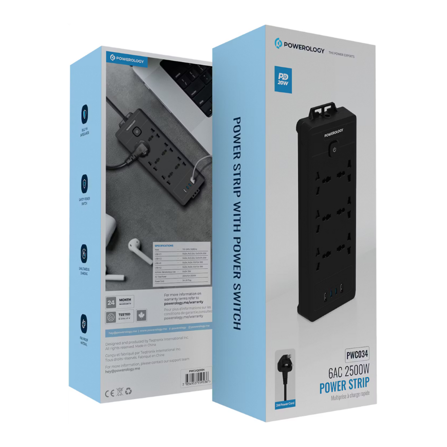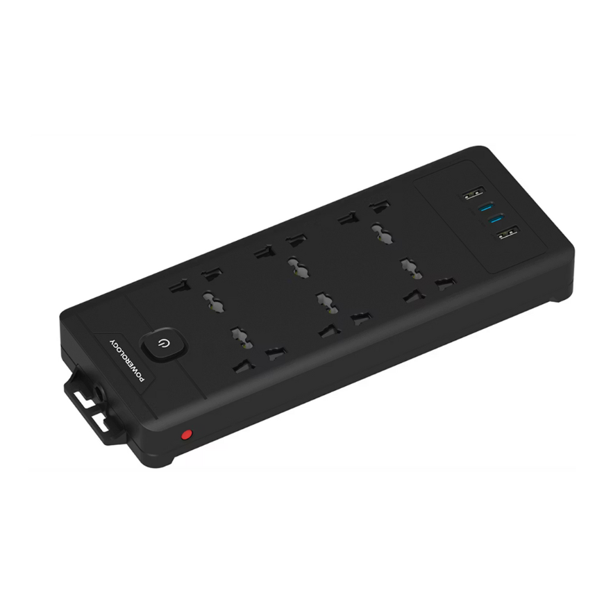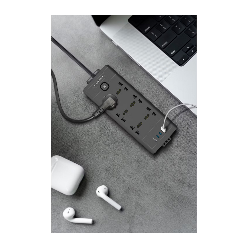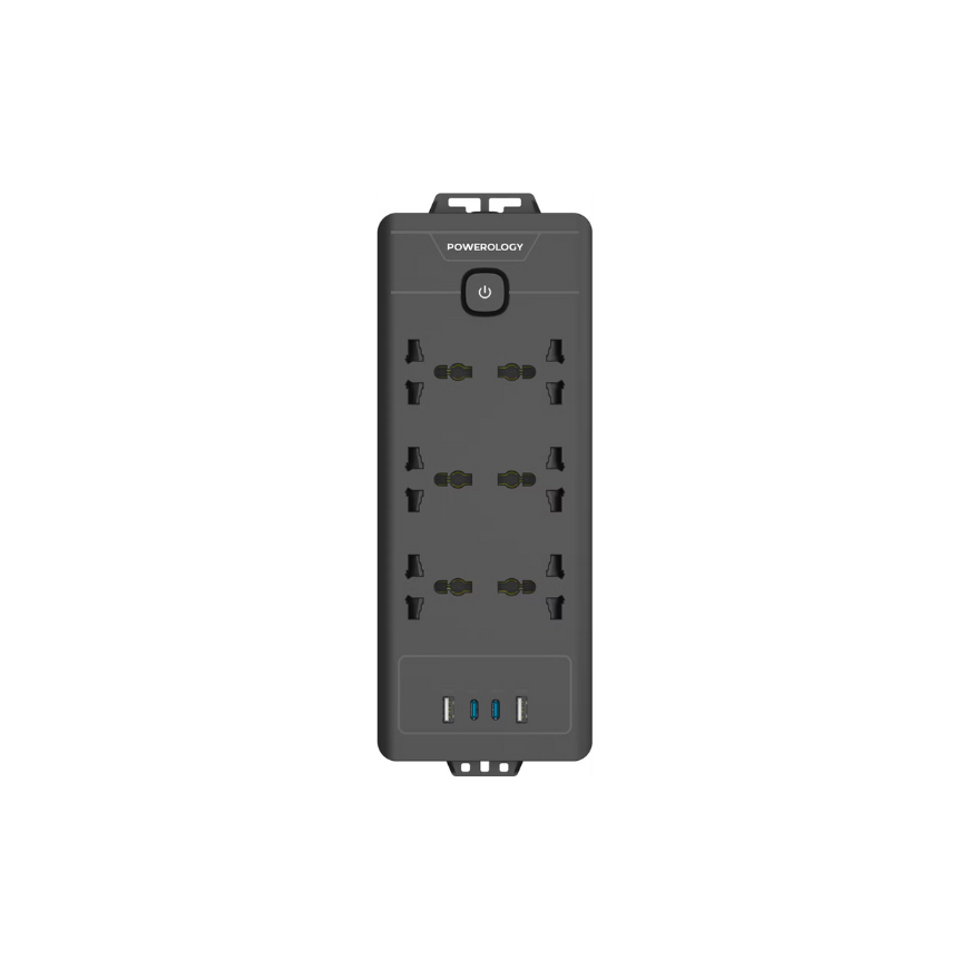 Power and convenience in one sleek unit. This Powerology strip offers six universal AC sockets and four fast-charging USB ports—two USB‑C (20 W each) and two USB‑A (18 W each)—ideal for powering laptops, monitors, phones, tablets, and more (powerology.me). With a total AC power capacity of 2500 W and 110–240 V compatibility, it’s ready for heavy-duty use at home, the office, or your gaming setup (greenlion.qa).