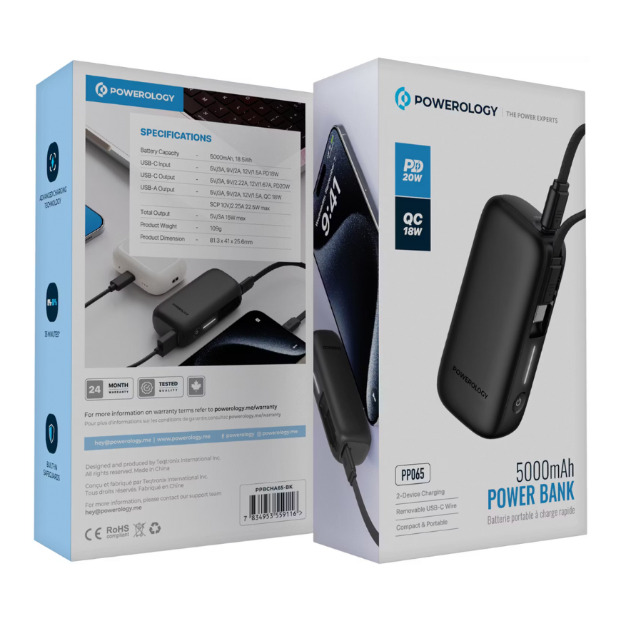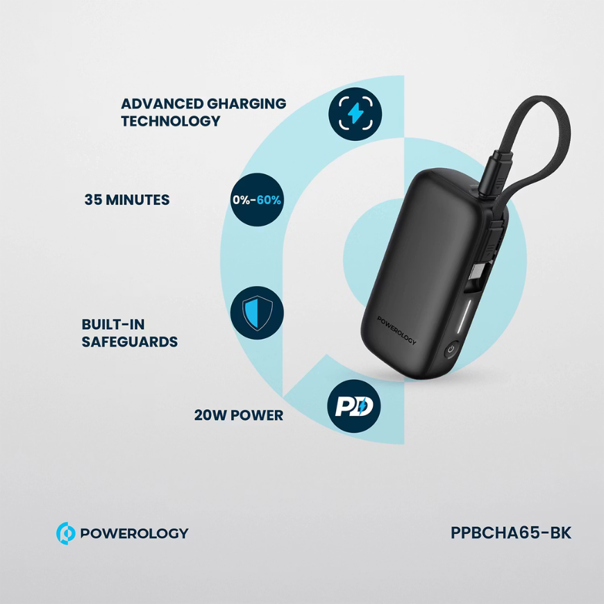 Powerology PD 20 W + QC 18 W PP065 Power Bank – 5,000 mAh, Black